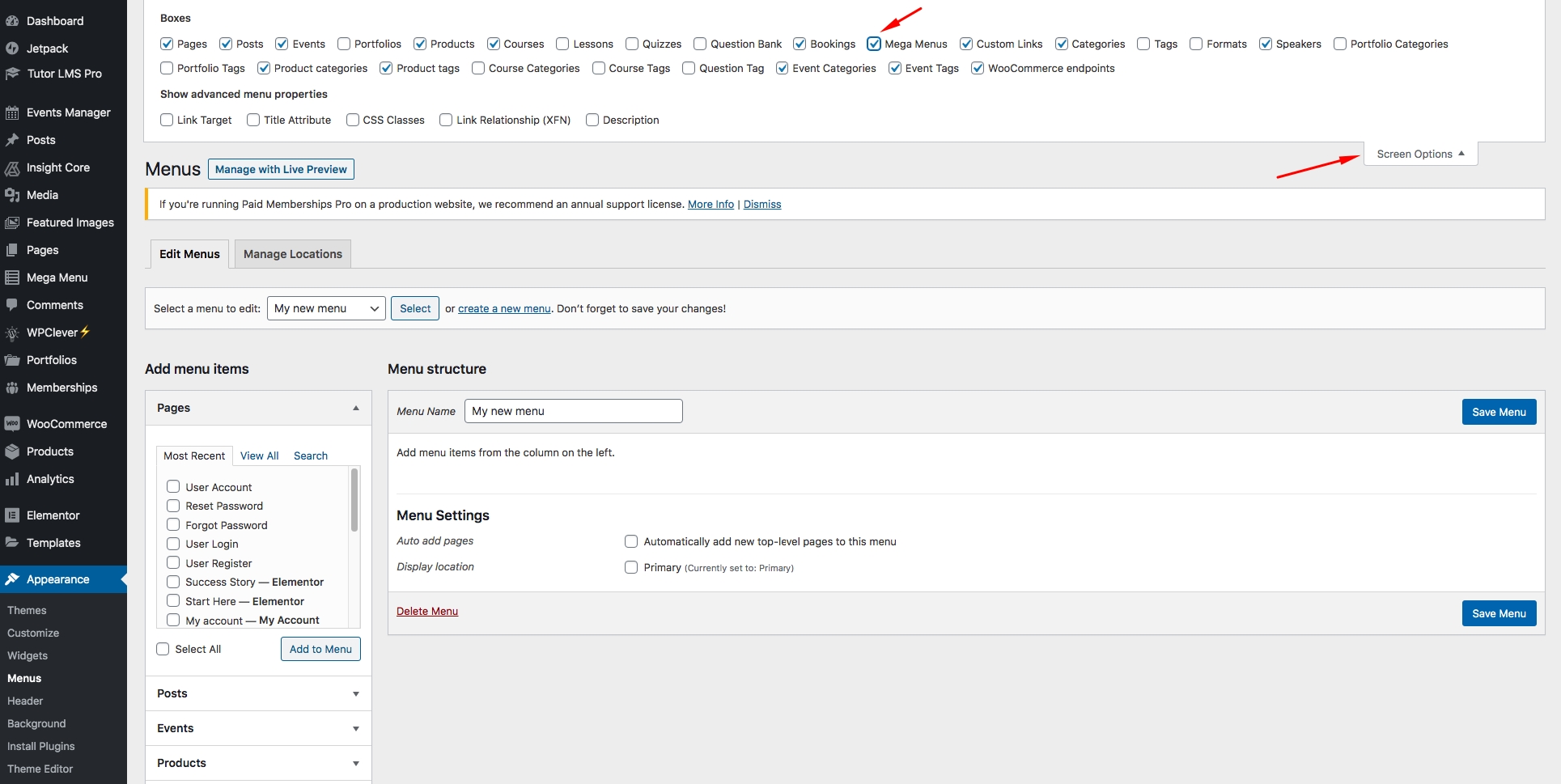 Step 4: After you've done creating your Mega Menu, navigate to Appearance > Menus, click on the Screen Options at the top then put a tick on Mega Menus option.